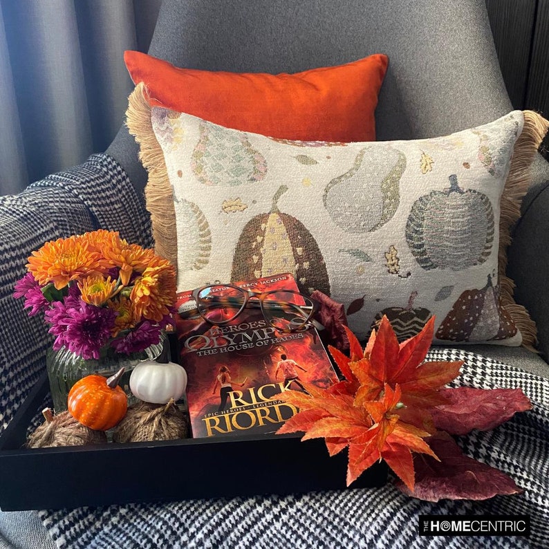 Embrace the cozy charm of autumn with The HomeCentric’s “Cozy Pumpkins”, a beautifully handcrafted lumbar pillow cover designed to elevate your seasonal decor. Featuring a woven pumpkin pattern on luxurious Jacquard fabric, this pillow cover blends rich autumn hues – brown, yellow, beige, blue, and purple – to bring warmth and rustic elegance to your space.