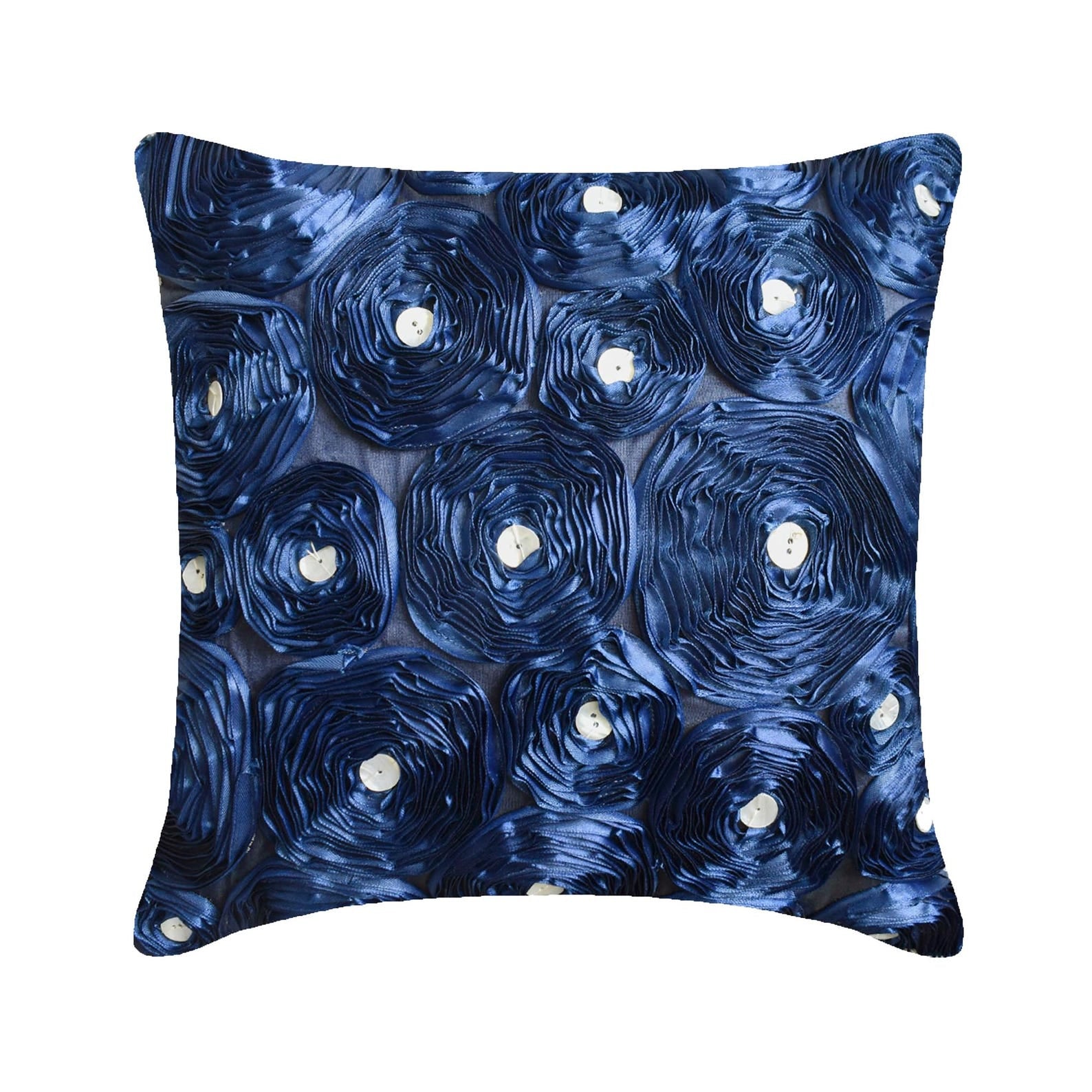 Navy Paradise is an exclusive, 100% handmade decorative silk pillow cover design. Made with art silk fabric, these navy blue pillow covers have an all-over floral design with the beautifully delicate flowers designed out of thin ribbon with a button at the center of each flower, giving this floral throw pillow cover its chic look.