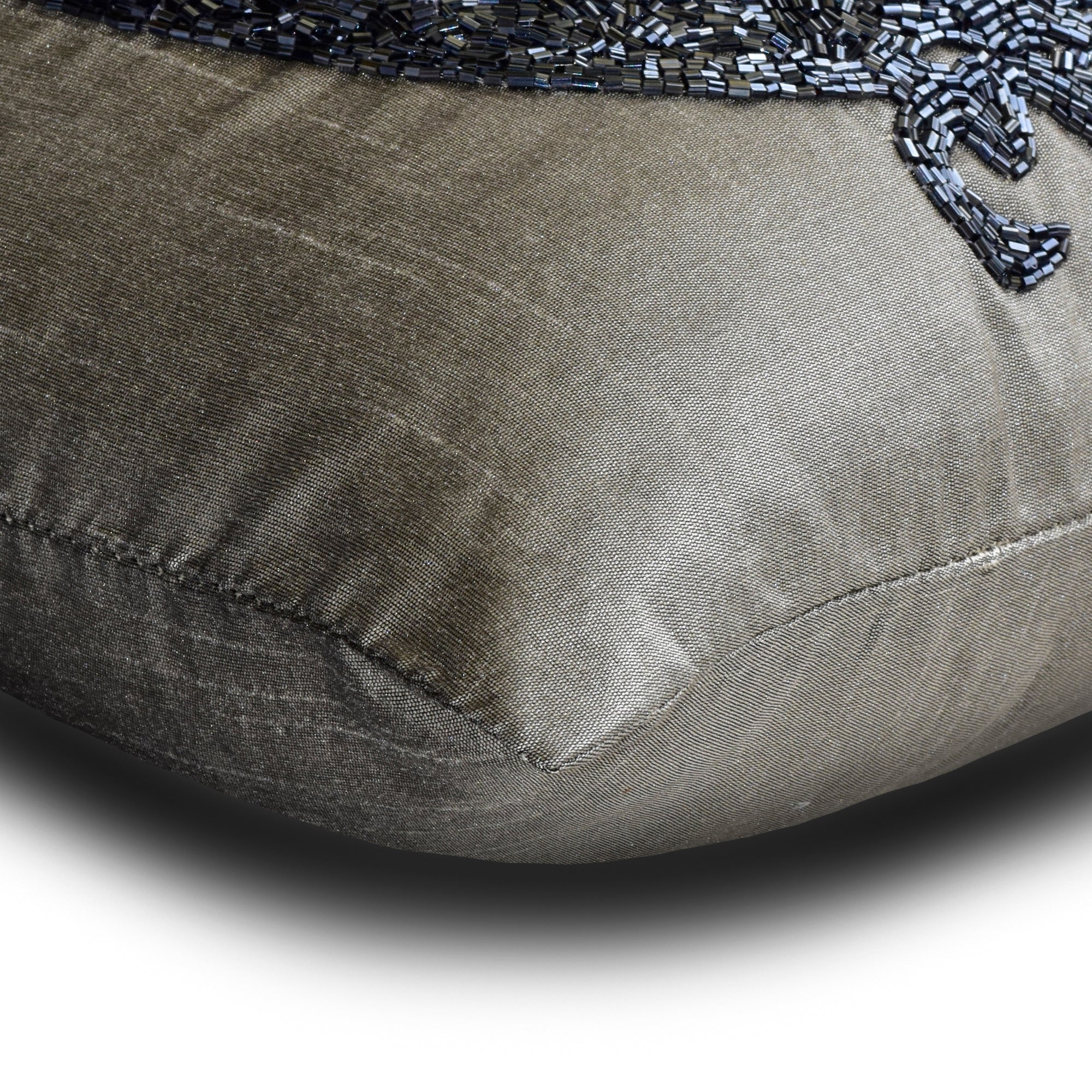 Fabric: Art Silk Material Used: Beads Fabric Color: Silver Pattern: Birds Style: Traditional Back of the cover: Plain Silver Art Silk Fabric For Insert Removal: Concealed flap covered zipper on the back for easy insertion and removal of inserts |