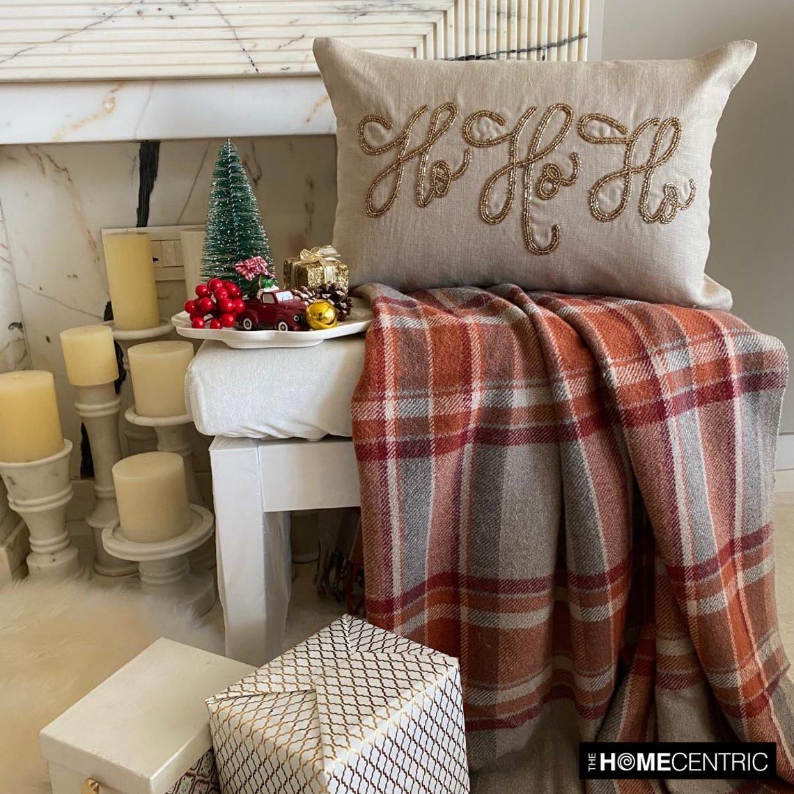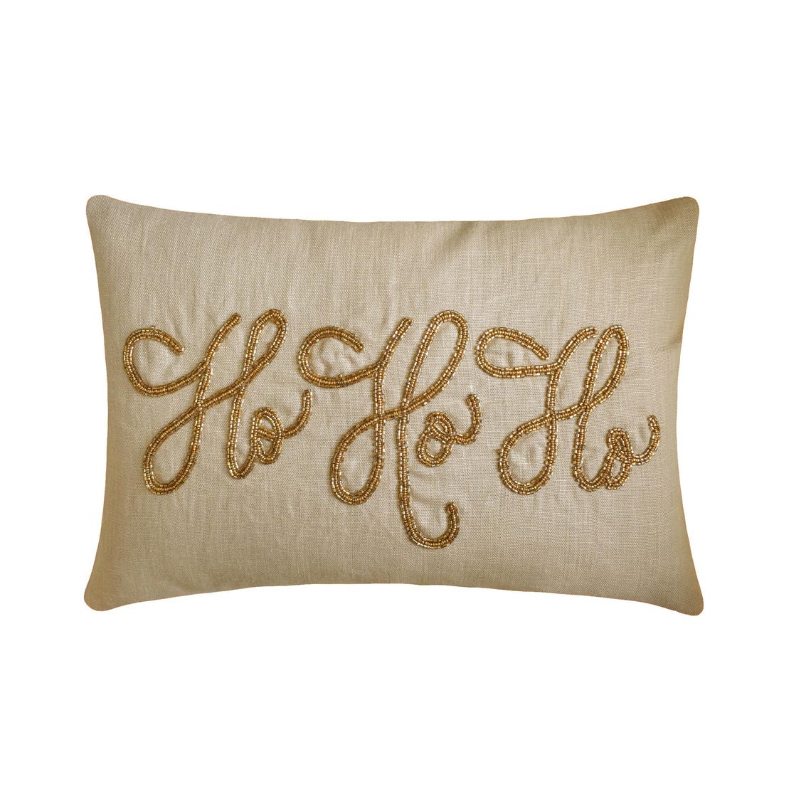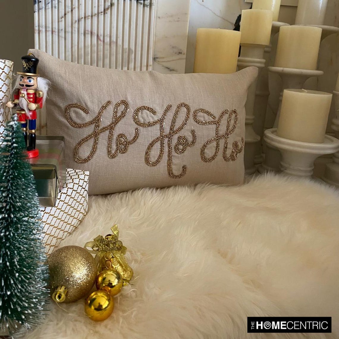 Bring the joy of Christmas into your home with the 'Ho Ho Ho' Lumbar Pillow Cover from The HomeCentric. Made from beige cotton linen, this oblong cushion cover features a gold bead-embroidered 'Ho Ho Ho' design, adding both festive cheer and modern elegance to your holiday décor.