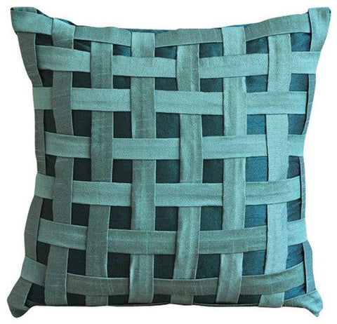 Peacock Green N Teal Basket Weave - Teal Blue Art Silk Throw Pillow Cover