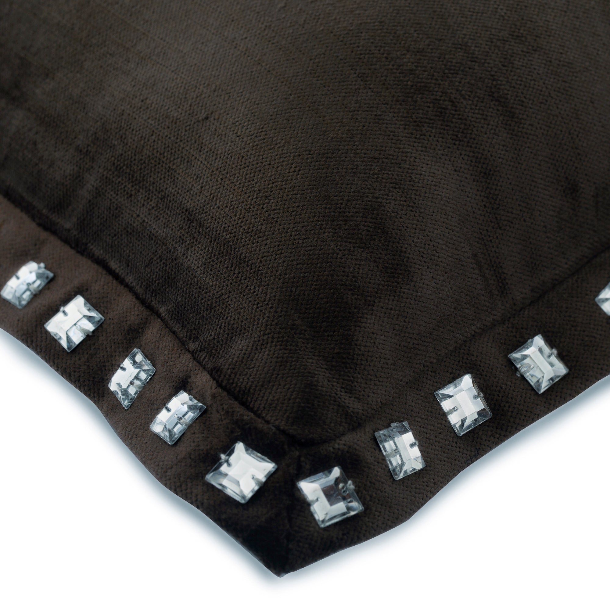 Ideal for home and office, this Charcoal Crystal Palace square pillow cover is beautifully designed by Indian artisans to suit your luxurious style. Meticulously handcrafted, this pillow cover features crystal embellishments on the border, creating a perfect silhouette. The chic and simple design stands out due to the use of a solid color front. | Complementing the sophisticated design, velvet fabric brings out the elegant essence of this decorative pillow cover brings. Available in an array of colors, this contemporary style pillowcase will look fabulous on your sofa, bed, or in the study. Try teaming embroidered front pillowcases with this design. |