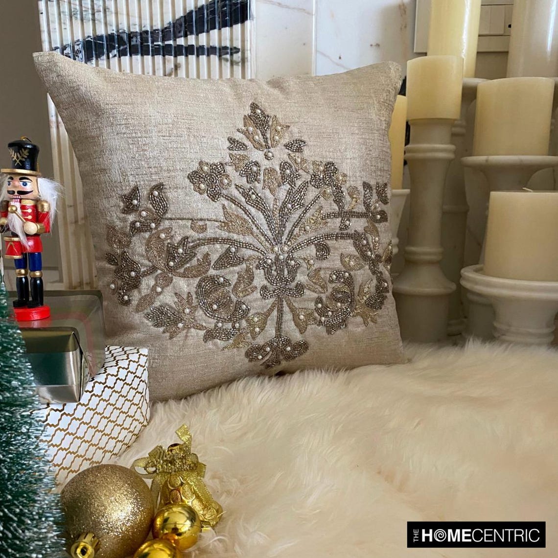 Elevate your holiday home décor with the Deco Flake Throw Pillow Cover from The HomeCentric. Handmade from gold jacquard, this luxurious pillow features intricate Zardozi embroidery, beads, and pearls, creating a shimmering snowflake and damask design. Perfect for those who love Art Deco elegance with festive charm.