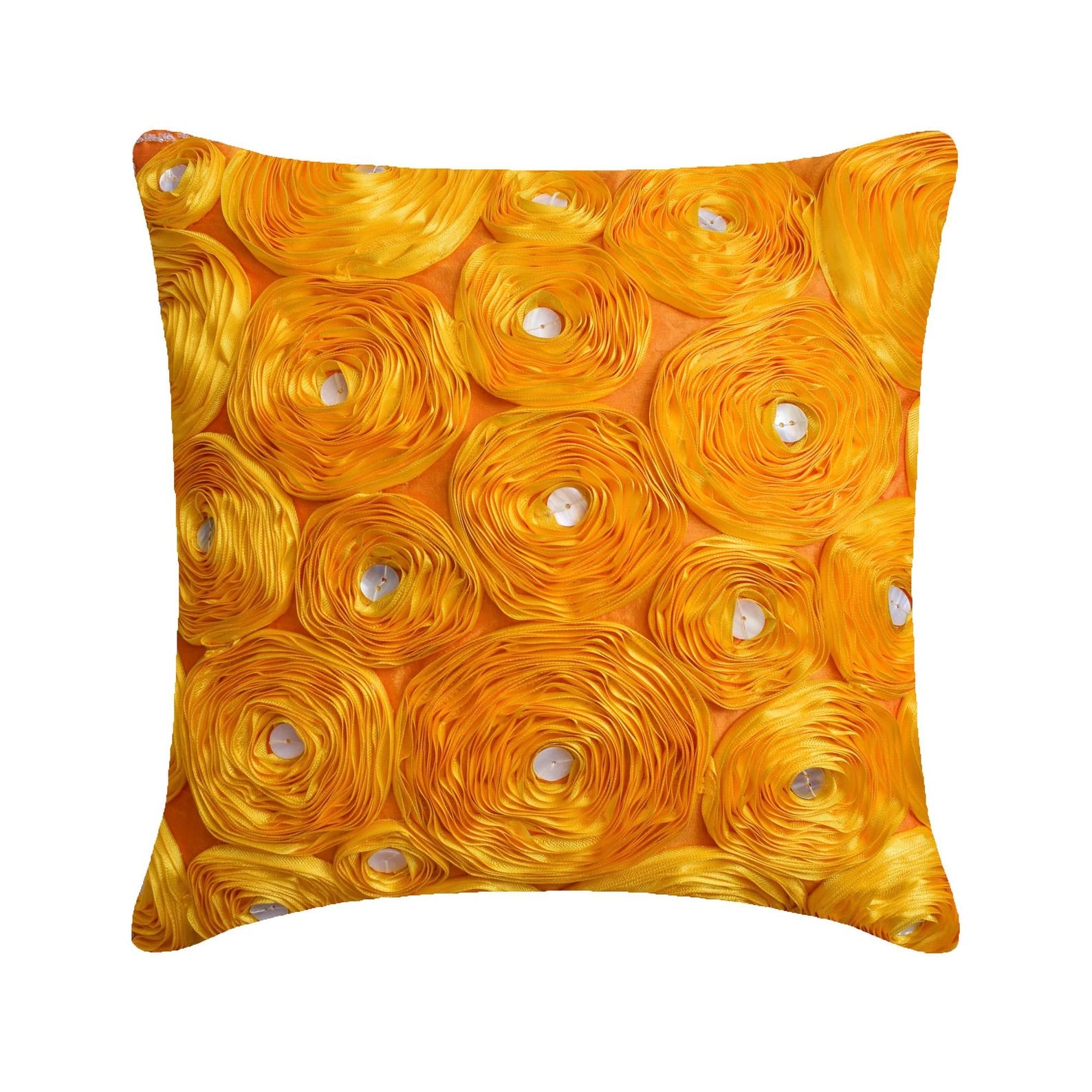 Marigold is an exclusive, 100% handmade decorative silk euro sham design. Made with art silk fabric, these orange euro shams have an all-over floral design with the beautifully delicate flowers designed out of thin ribbon with a button at the center of each flower, giving this floral euro sham its chic look.