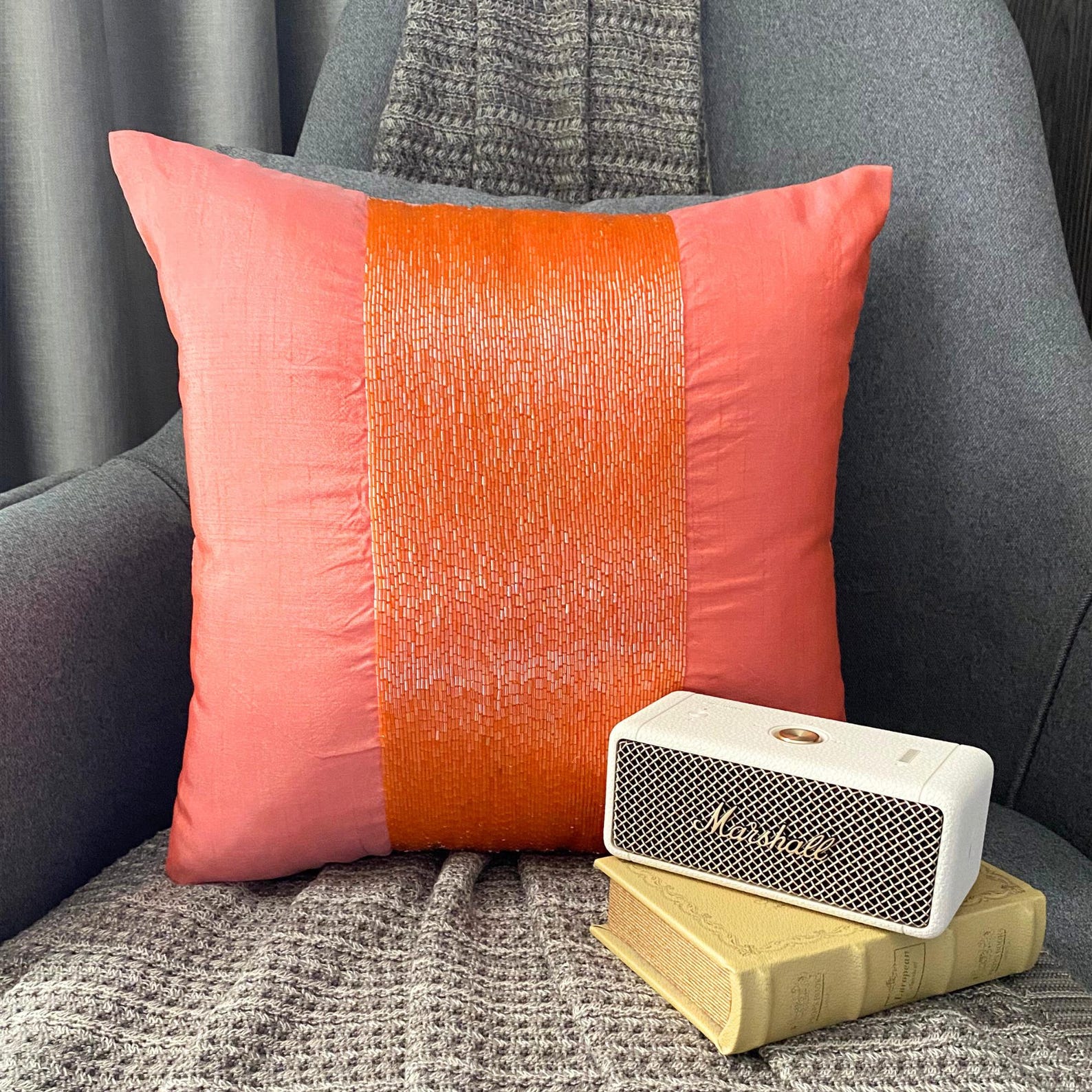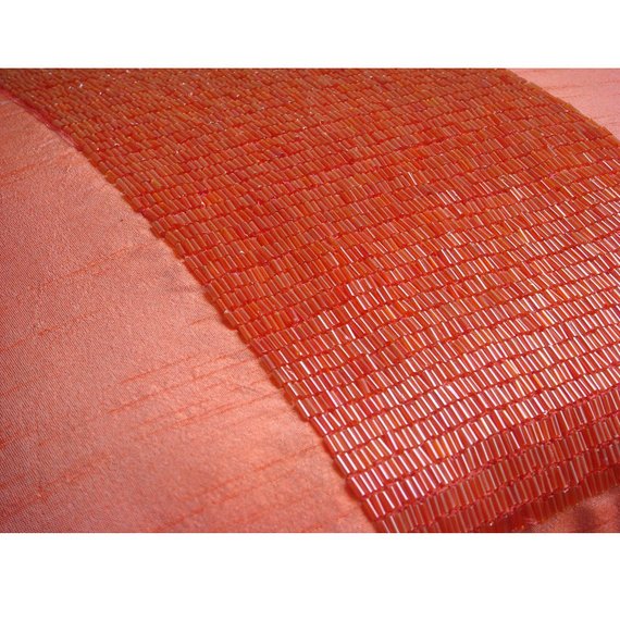 Fabric: Art Silk Material Used: Beads Fabric Color: Orange Pattern: Solid Color Style: Modern Back of the cover: Plain Peach Orange Art Silk Fabric For Insert Removal: Concealed flap covered zipper on the back for easy insertion and removal of inserts |