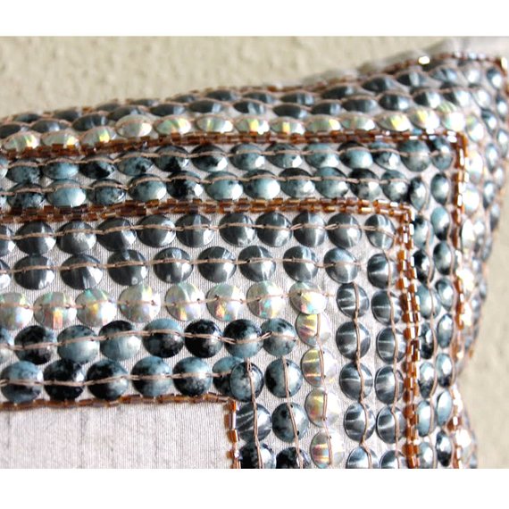 This light gray pillow cover, made of art silk fabric, has a fancy border that’s handcrafted impeccably. Comprised of three different colored sequins separated by bugle beads to add more interest to the pattern, this silk pillow cover is very attractive.