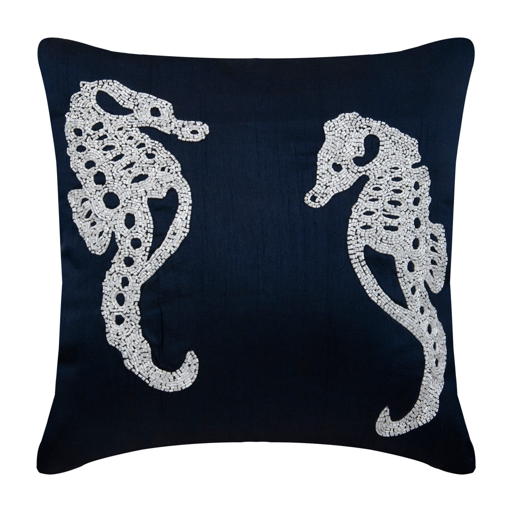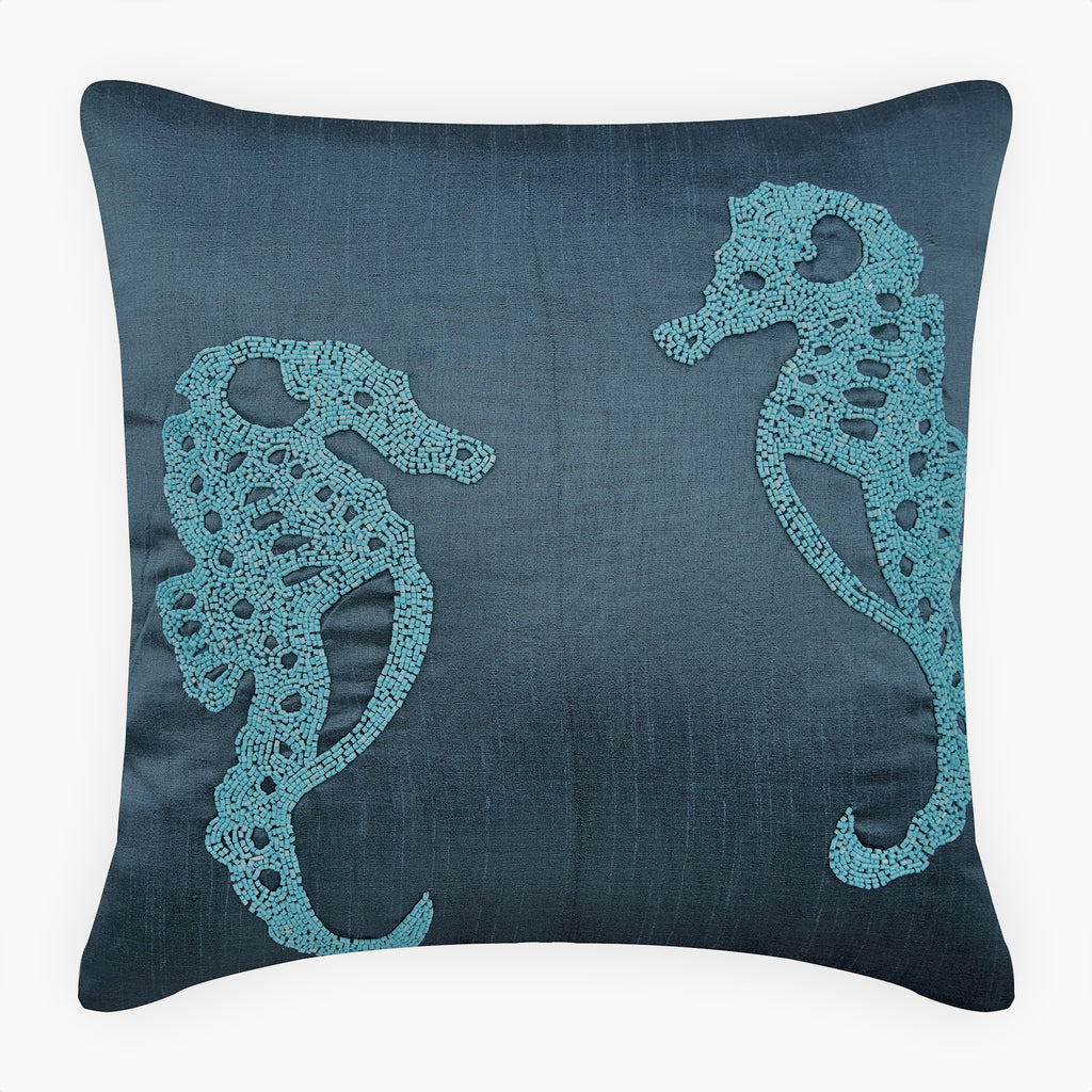 An exclusive 100% handmade decorative silk throw pillow cover, the Sea Horse Aqua is designed and fashioned with intricate detailing. Pair it with white throw pillow covers and watch your space transform into a beach haven.