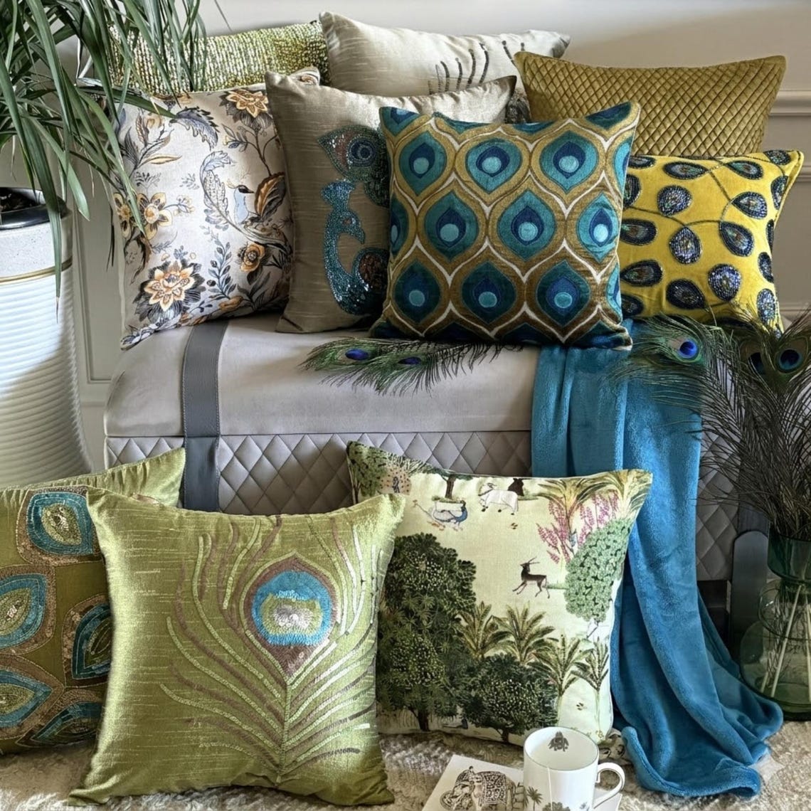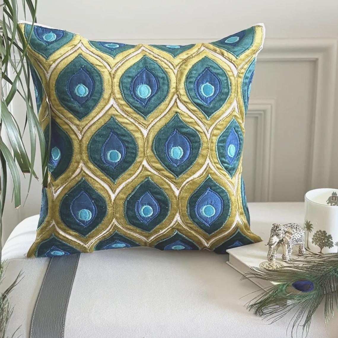Art Deco Peacock is an exclusive 100% handmade decorative throw pillow cover designed and created with intrinsic detailing. A perfect item to decorate your living room, bedroom, office, couch, chair, sofa or bed.