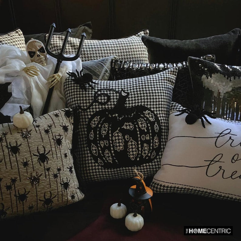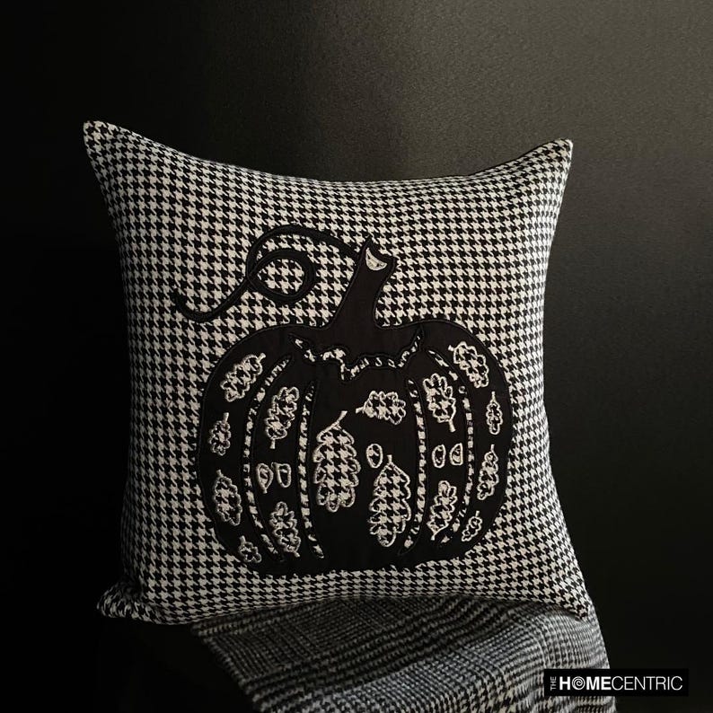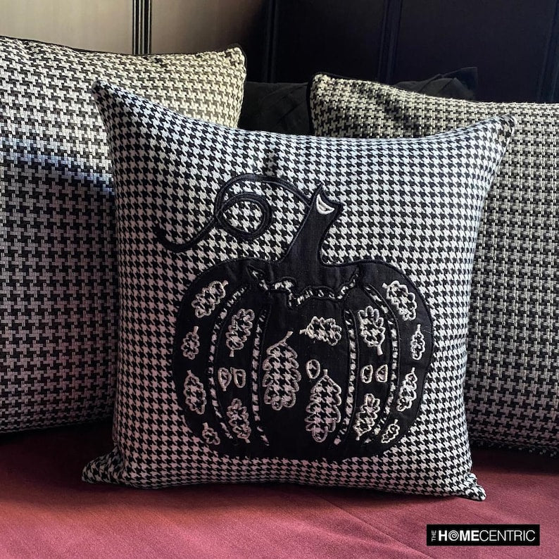 Redefine seasonal elegance with The HomeCentric’s “Classic Pumpkin”. Handcrafted from luxurious houndstooth Jacquard fabric, this pillow cover features monochrome pumpkin appliqués that bring a sophisticated twist to traditional fall and Halloween decor.