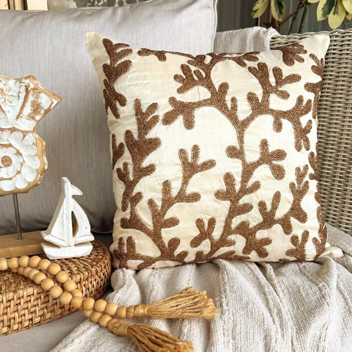 Aptly named, the Coral Shine is a beautiful beach themed pillow cover that has delicately embroidered coral design with beads that showcase intricate craftsmanship and detailing.