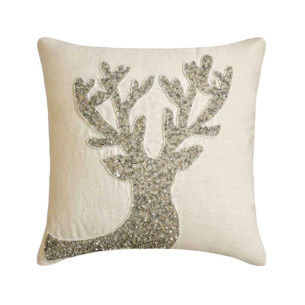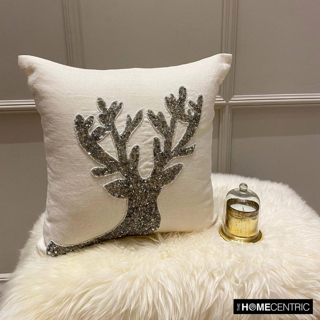 Bring modern sophistication and a festive touch to your home with the 'Dazzling Deer' Throw Pillow Cover from The HomeCentric. Handmade from ivory cotton linen, this cushion cover features a striking silver beaded reindeer head design, adding elegance and sparkle to your Christmas décor.