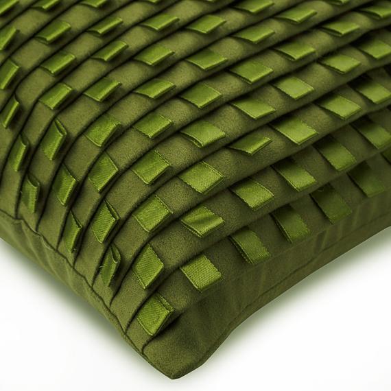Go Green is a striped euro sham that exudes some serious class. Designed with pintucks and ribbons on faux suede fabric in solid colors, this modern euro sham can transform just about any place in an instant. Along with the pintucks that give it its striped look, the folded satin ribbon in a slightly different shade stitched expertly into the pintucks, gives it a checkered look.
