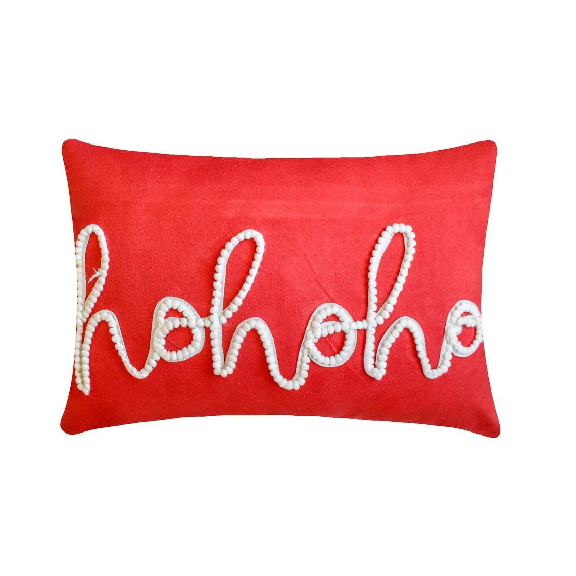 Celebrate the holidays with the 'Holiday Ho Ho' Lumbar Pillow Cover from The HomeCentric. Made from red suede, this oblong cushion cover features festive pom pom lace embroidered 'Ho Ho Ho', creating a fun and cozy vibe for your Christmas décor.