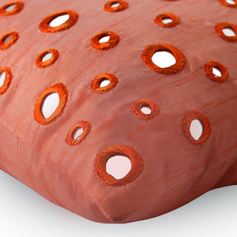 Fabric: Art Silk Material Used: Mirror Embroidery Fabric Color: Peach Orange Pattern: Circles & Dots Style: Contemporary Back of the cover: Plain Peach Orange Art Silk Fabric For Insert Removal: Concealed flap covered zipper on the back for easy insertion and removal of inserts |