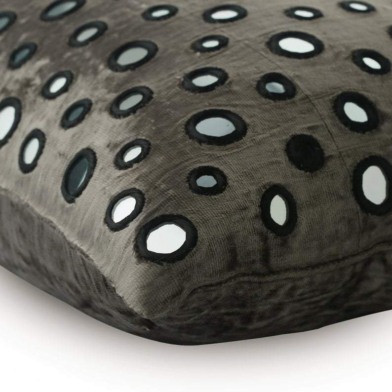 Fabric: Velvet Material Used: Mirror Embroidery Fabric Color: Gray Pattern: Circles & Dots Style: Contemporary Back of the cover: Plain Silver Velvet Fabric For Insert Removal: Concealed flap covered zipper on the back for easy insertion and removal of inserts |