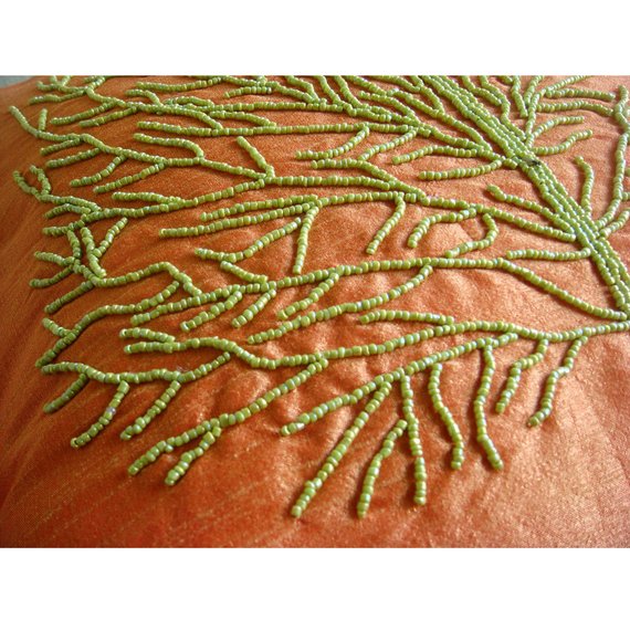 Fabric: Art Silk Material Used: Beads Fabric Color: Orange Pattern: Nature & Floral Style: Contemporary Back of the cover: Plain Orange Art Silk Fabric For Insert Removal: Concealed flap covered zipper on the back for easy insertion and removal of inserts |