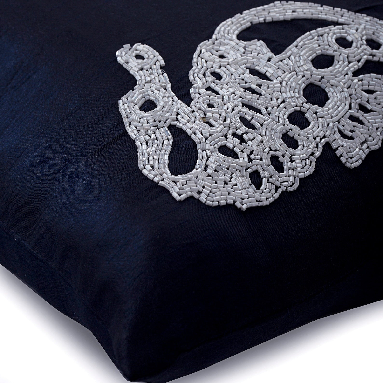 This beaded pillow cover has a hidden flap covered zipper for easy insertion and removal of inserts.