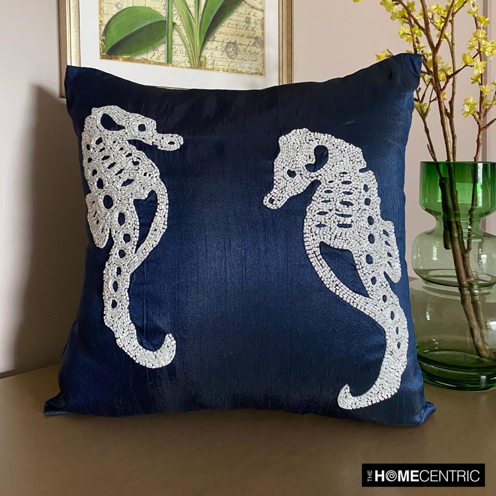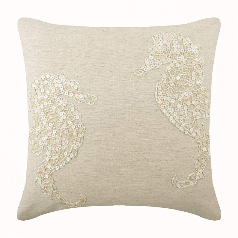 If you’re looking for something unique and extraordinary, check out Navy Blue Sea Horse. It is an exquisite 100% handmade pillow cover finished with a sea horse design. Both the sea horses on this pillow cover are made from matte sequins, tiny pearl beads, and regular bugle beads to lend a polished look. | We have designed this adorable pillow cover with luxe art silk, sequins, pearl beads and bugle beads. It is perfect for homes with tropical or beach-style interiors. It will also look fabulous in the Mediterranean style homes. This cushion cover is made in India and comes with a hidden flap covered zipper for easy insertion and removal of the insert. |