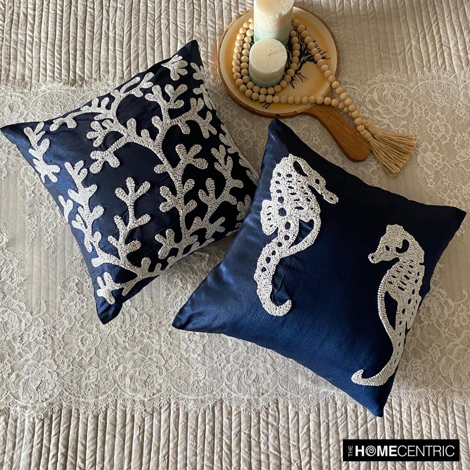 An exclusive 100% handmade decorative silk throw pillow cover, the Navy Blue Sea Horse is designed and fashioned with intricate detailing. Pair it with white and varying shades of navy blue throw pillow covers and watch your space transform into a beach haven.