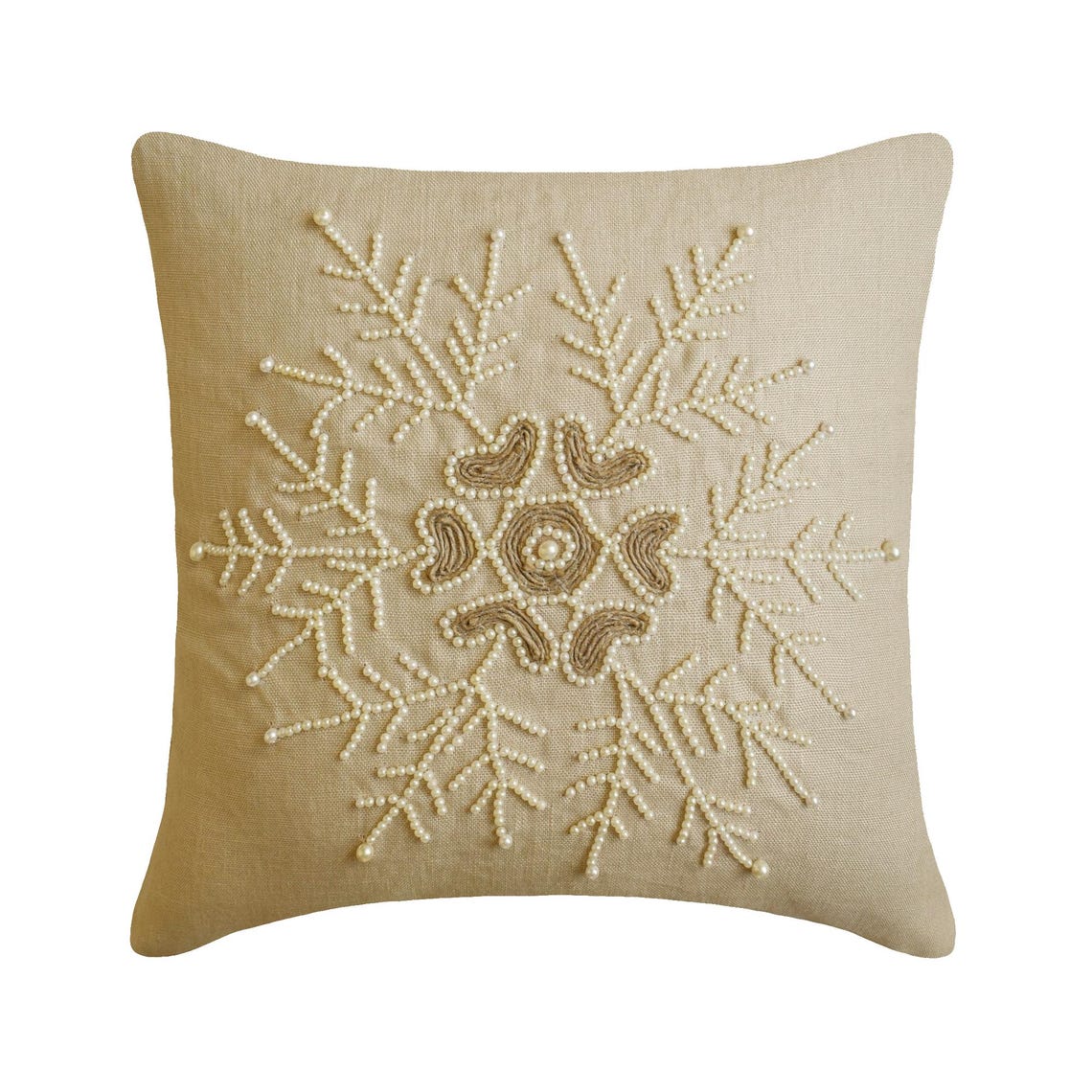 Elevate your holiday décor with the "Pearl Flake" Throw Pillow Cover from The HomeCentric. Handmade from cotton linen, this pillow features a delicate snowflake design accented with pearl and jute embroidery, creating a modern, sophisticated Christmas look.