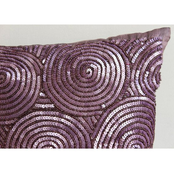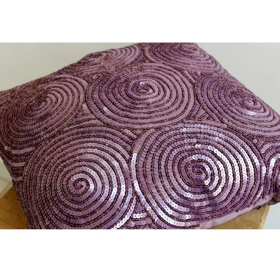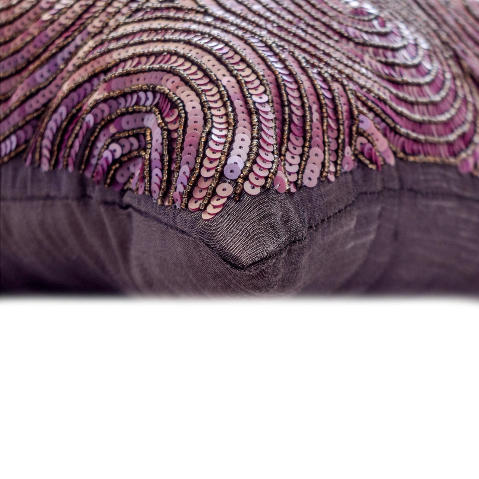 Ideal for bringing out the accents of your home décor, the Purple Touch is an exclusive 100% handmade silk pillow cover designed and fashioned with intricate detailing. These embroidered pillow covers have highly stylized swirl patterns in purple sequins. The beautiful sequin swirls on this purple pillow cover are delicately embroidered across the entire front face giving this modern throw pillow cover its rich look.