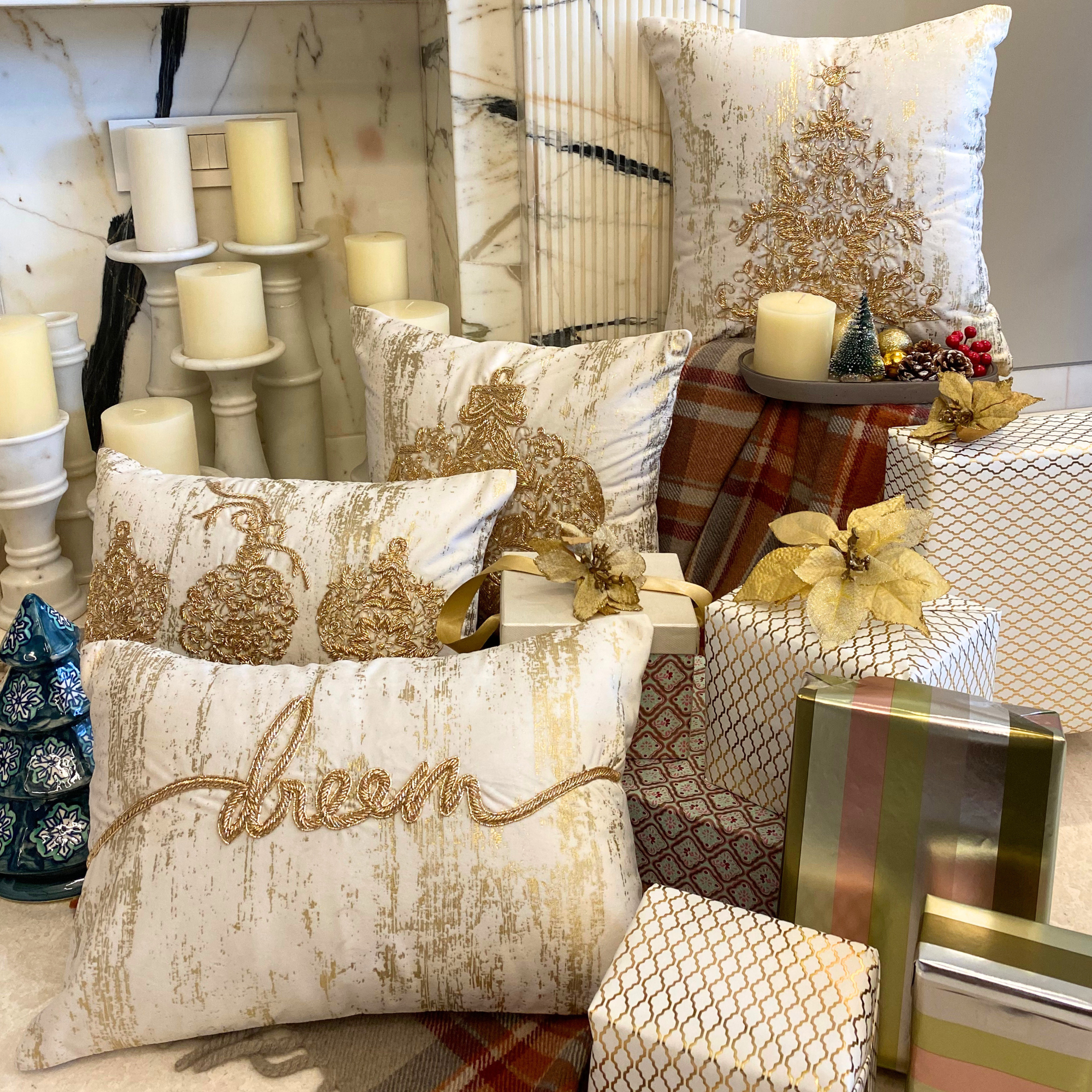 Celebrate the season with the 'Shimmer Ornament' Throw Pillow Cover from The HomeCentric. Made from ivory velvet, this cushion cover features an elegant gold foil Christmas ornament design, enhanced with intricate Zardozi embroidery, creating a stunning and festive focal point for your holiday décor.