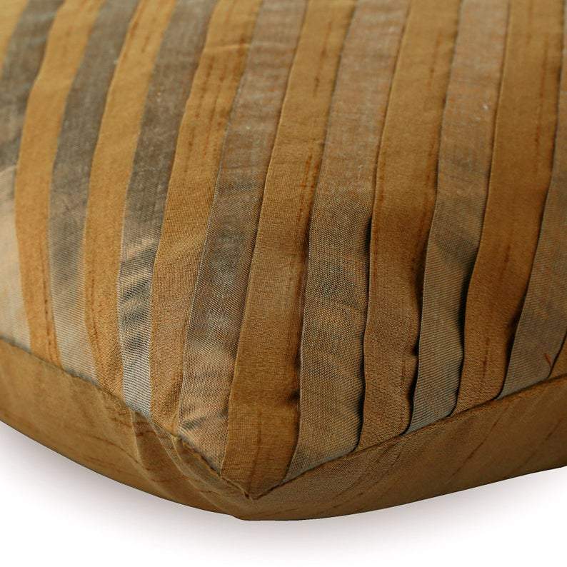 Unfolding Gold Copper is a silk euro sham made with art silk dupion fabric. This gold euro sham has the classic striped design that never goes out of style. The alternating gold and teal euro sham design on this modern euro sham is just what you need to add that extra touch of class to any space in your home or office. The stripes on this silk euro sham are carefully folded silk fabric flaps that require careful craftsmanship. This striped euro sham has a matching plain fabric in art silk on the back, with a hidden-flap covered zipper for easy insertion and removal of inserts.