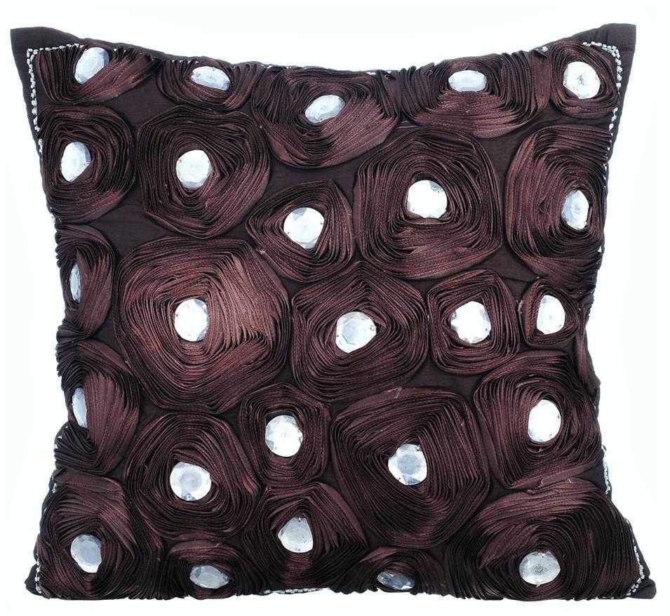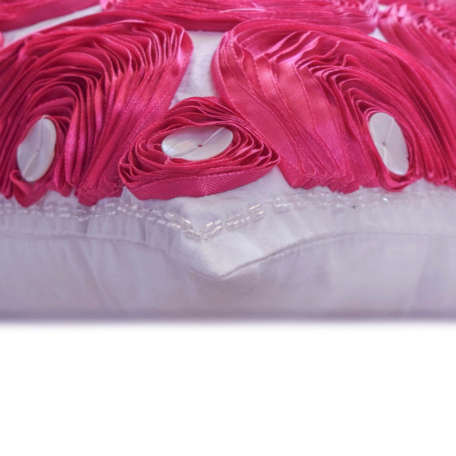 Vintage Joy is an exclusive, 100% handmade decorative silk pillow cover design. Made with art silk fabric, these fuchsia pillow covers have an all-over floral design with the beautifully delicate flowers designed out of thin ribbon with a button at the center of each flower, giving this floral throw pillow cover its chic look.