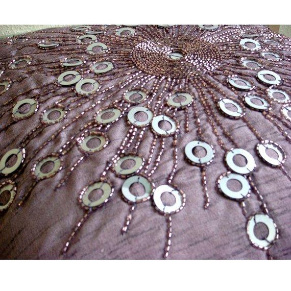 Fabric: Art Silk Material Used: Beads Fabric Color: Purple Pattern: Abstract Style: Modern Back of the cover: Plain Purple Art Silk Fabric For Insert Removal: Concealed flap covered zipper on the back for easy insertion and removal of inserts |