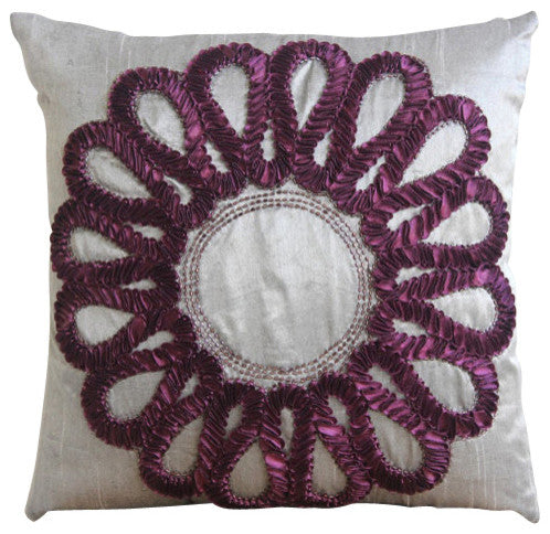 We All Blossom is a contemporary pillow cover designed with some exclusive detailing. The design on the pillow cover represents a flower and is made from ruffled ribbons and seed beads. You can buy this designer piece in 8 sizes ranging from 12x12 inches to 26x26 inches and 3 lustrous shades. | This decorative pillow cover is made from rich, high-quality art silk, ribbons, and seed beads. Perfect for modern, transitional, and traditional décors, the throw pillow cover can suit glam-inspired homes as well. It is 100% handmade in India by professional artisans and comes with a hidden flap covered zipper for ease of use. |