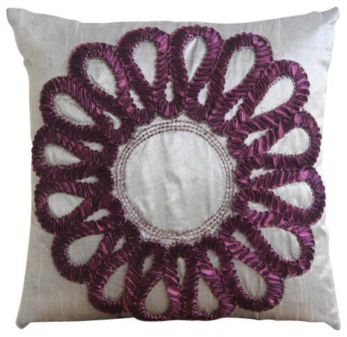 We All Blossom is a contemporary euro sham designed with some exclusive detailing. The design on the euro sham represents a flower and is made from ruffled ribbons and seed beads. You can buy this designer piece in 8 sizes ranging from 12x12 inches to 26x26 inches and 3 lustrous shades. | This decorative euro sham is made from rich, high-quality art silk, ribbons, and seed beads. Perfect for modern, transitional, and traditional décors, the decorative euro sham can suit glam-inspired homes as well. It is 100% handmade in India by professional artisans and comes with a hidden flap covered zipper for ease of use. |