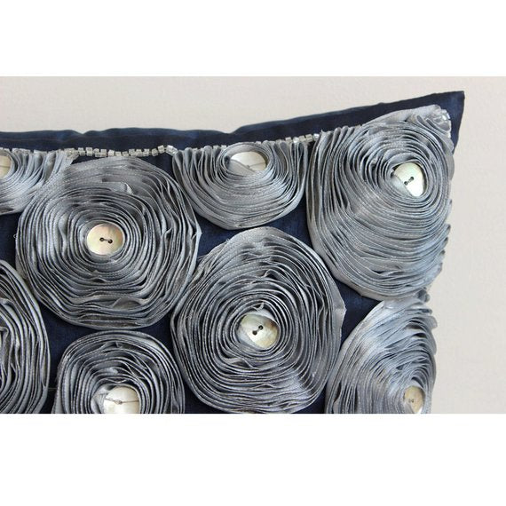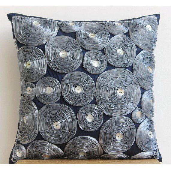 Whirlwind is an exclusive, 100% handmade decorative silk pillow cover design. Made with art silk fabric, these black gray pillow covers have an all-over floral design with the beautifully delicate flowers designed out of thin ribbon with a button at the center of each flower, giving this floral throw pillow cover its chic look.