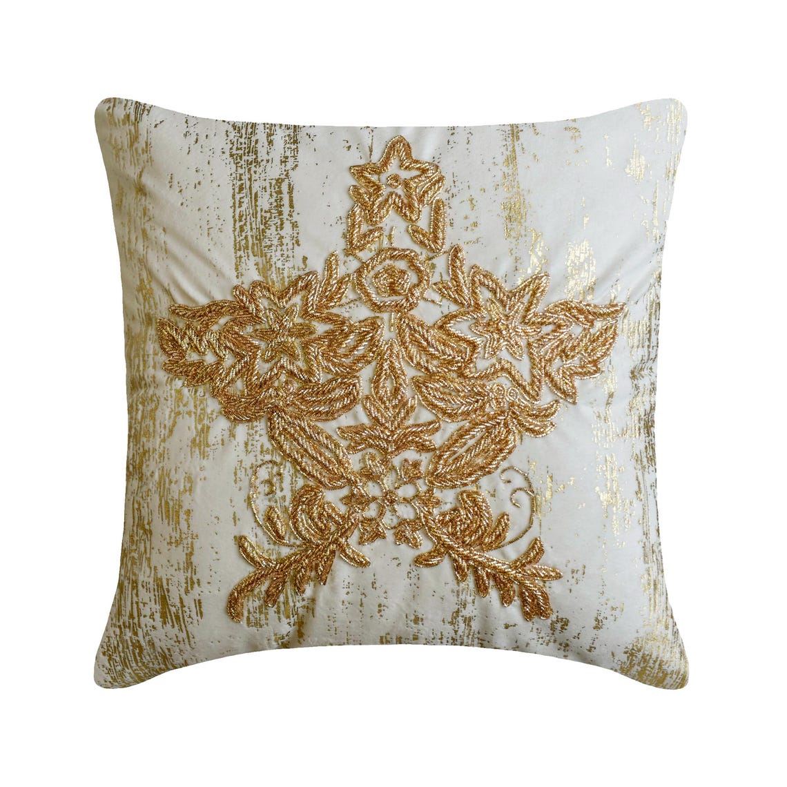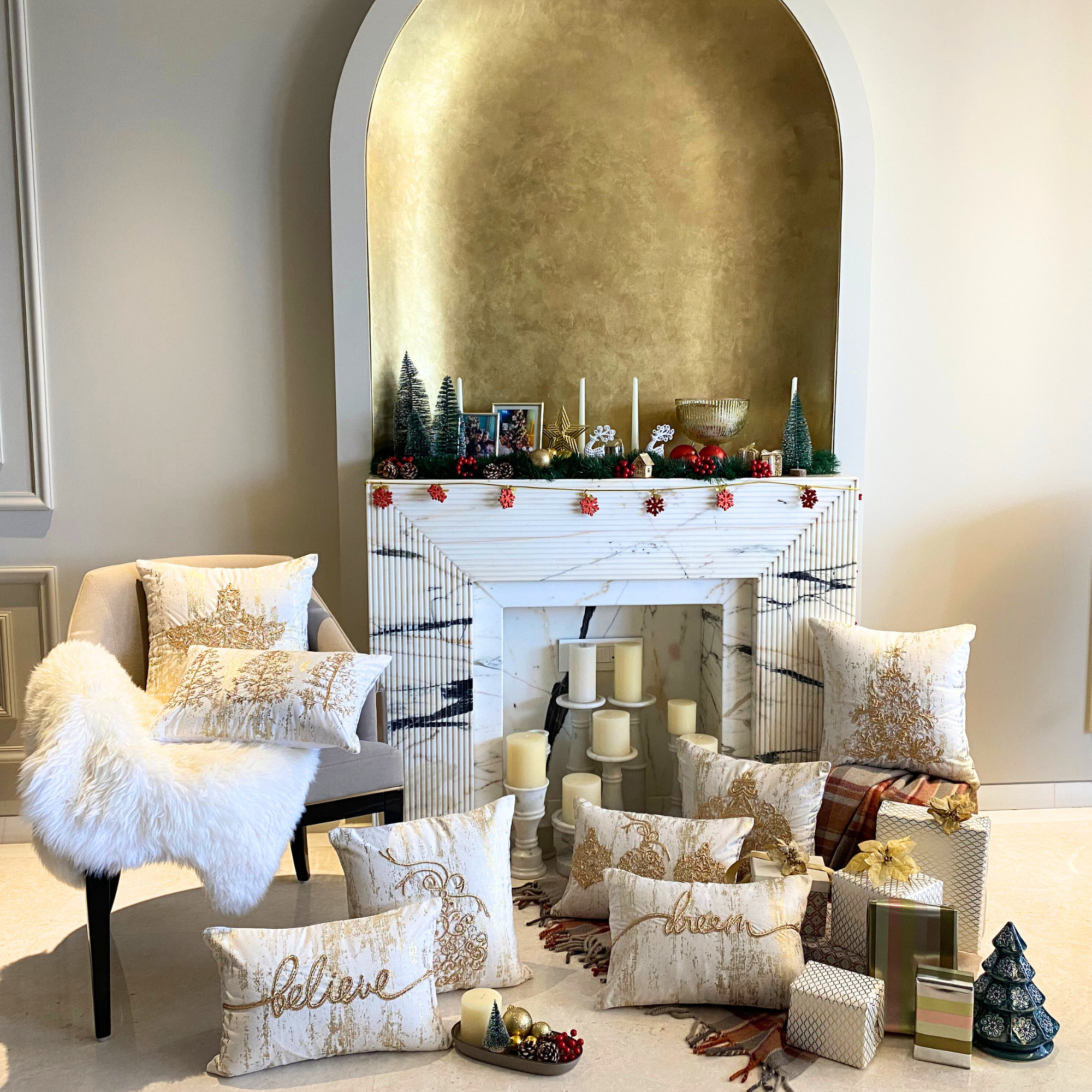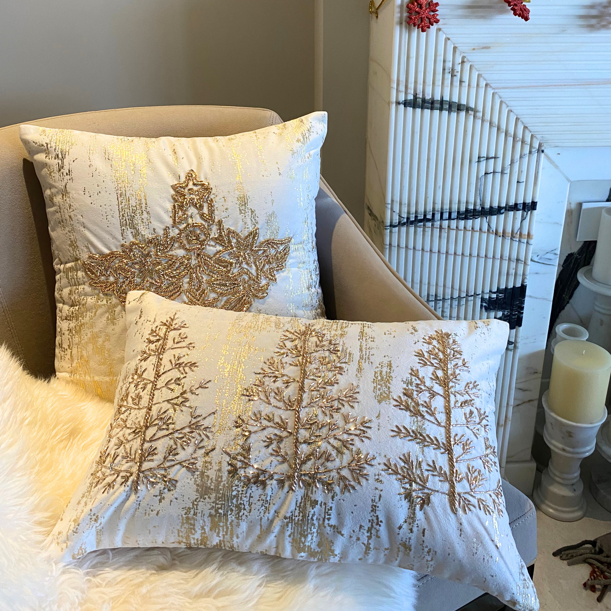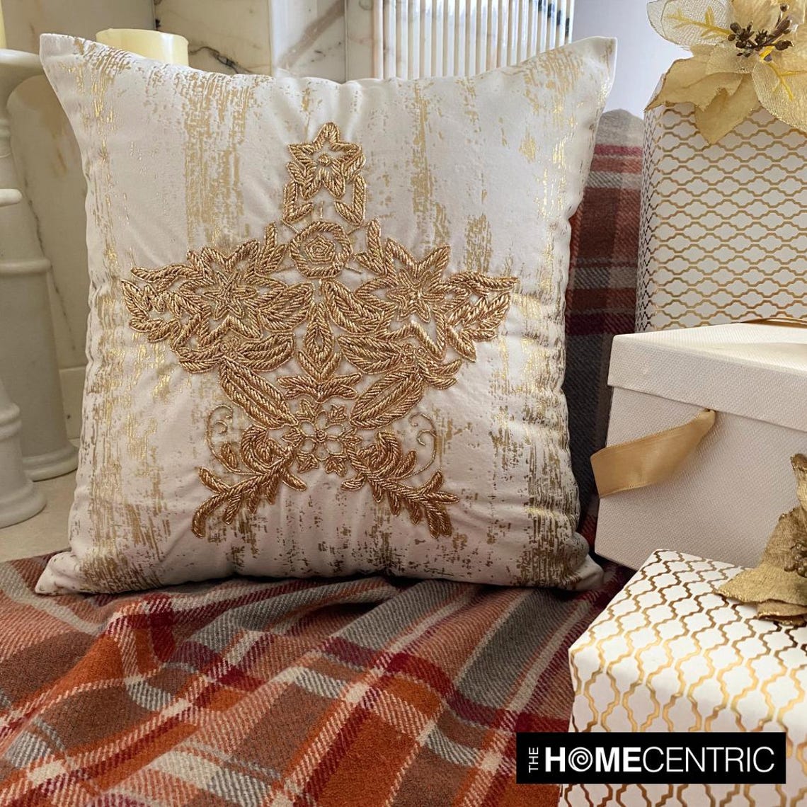 Bring modern elegance and holiday sparkle into your home with the 'Xmas Star' Throw Pillow Cover from The HomeCentric. Made from ivory velvet, this cushion cover features a dazzling gold foil Christmas star design with intricate Zardozi embroidery, creating a stunning and festive accent for your Christmas décor.